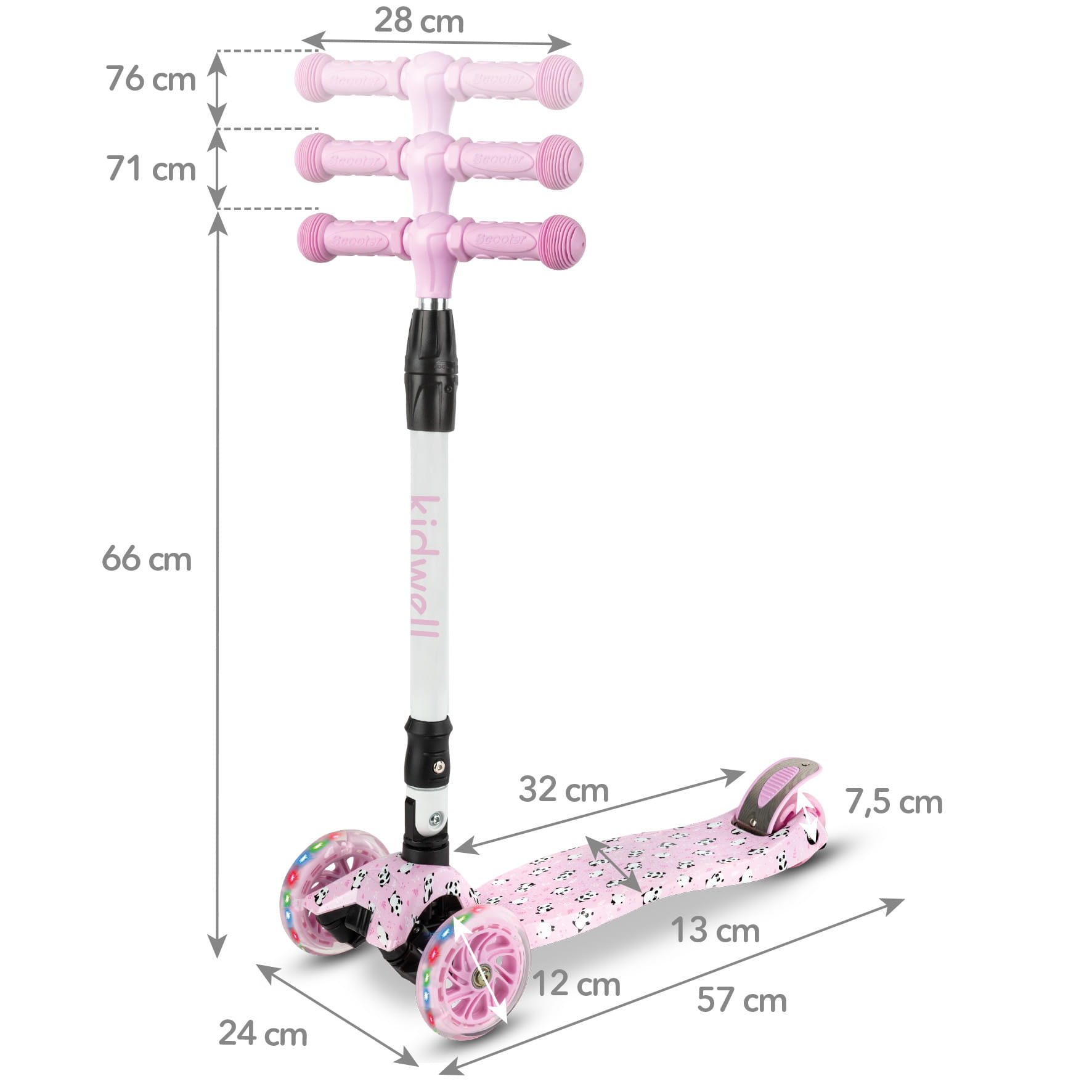 - Materiały: Aluminiowa kierownica, plastikowy podest, poliuretanowe koła z diodami LED