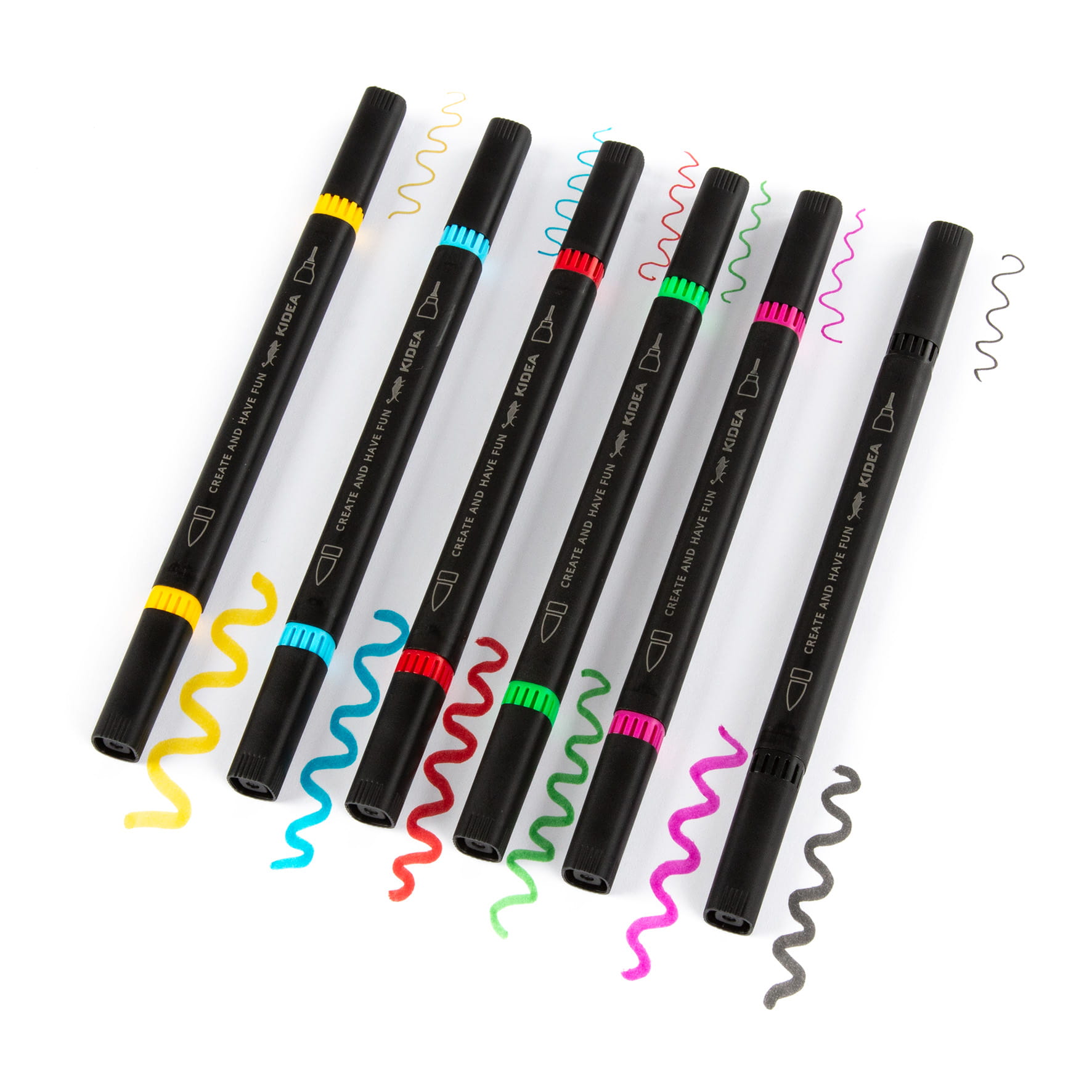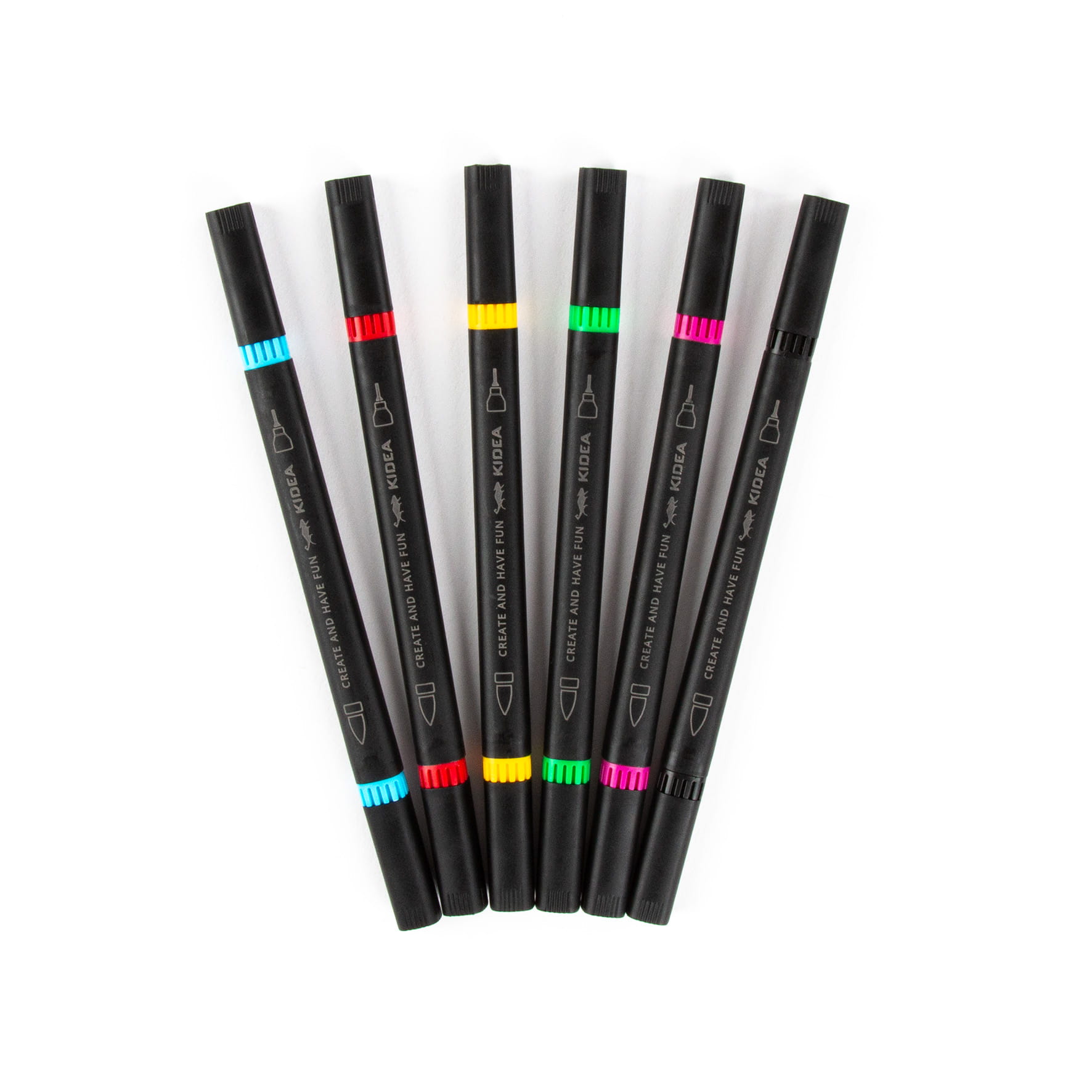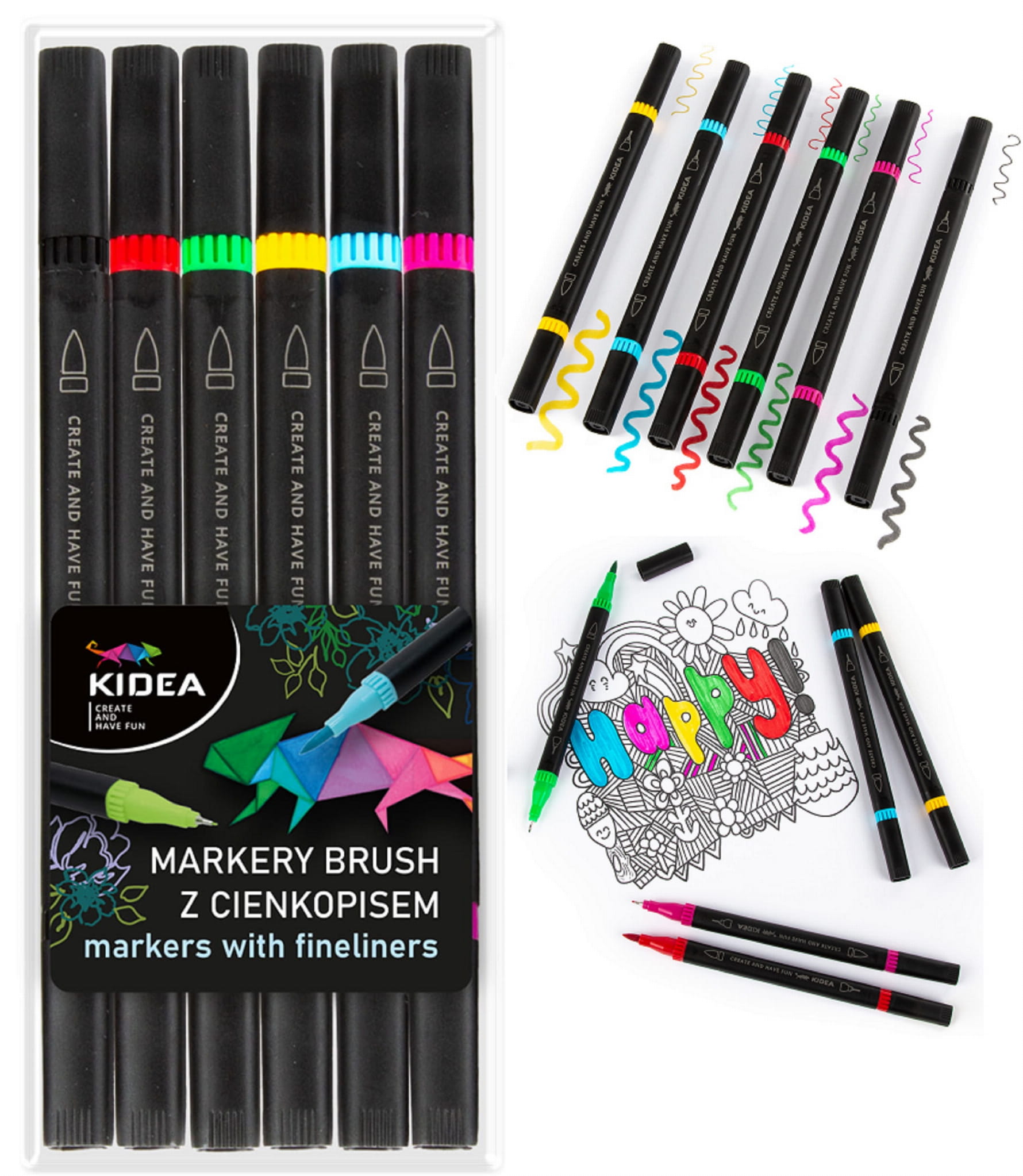 Dwustronne markery artystyczne w 6 żywych kolorach: czarnym, czerwonym, zielonym, żółtym, niebieskim oraz różowym. Każdy z nich wyposażony jest w dwie profesjonalne końcówki - precyzyjną, cienką do kreślenia delikatnych linii i detali oraz szerszą pędzelkową, doskonałą do wypełniania większych powierzchni i efektownych gradientów. Doskonale sprawdzą się podczas nauki i tworzenia notatek.