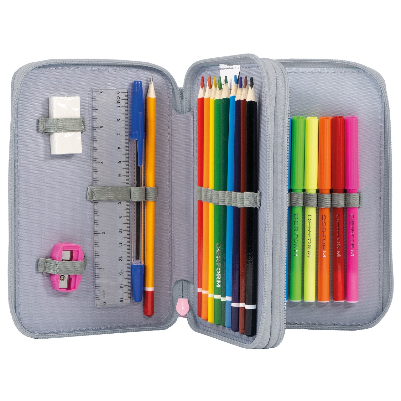 Funkcjonalny i wygodny piórnik szkolny podwójny Derform z pełnym wyposażeniem to idealne rozwiązanie dla dzieci i uczniów szkoły podstawowej.