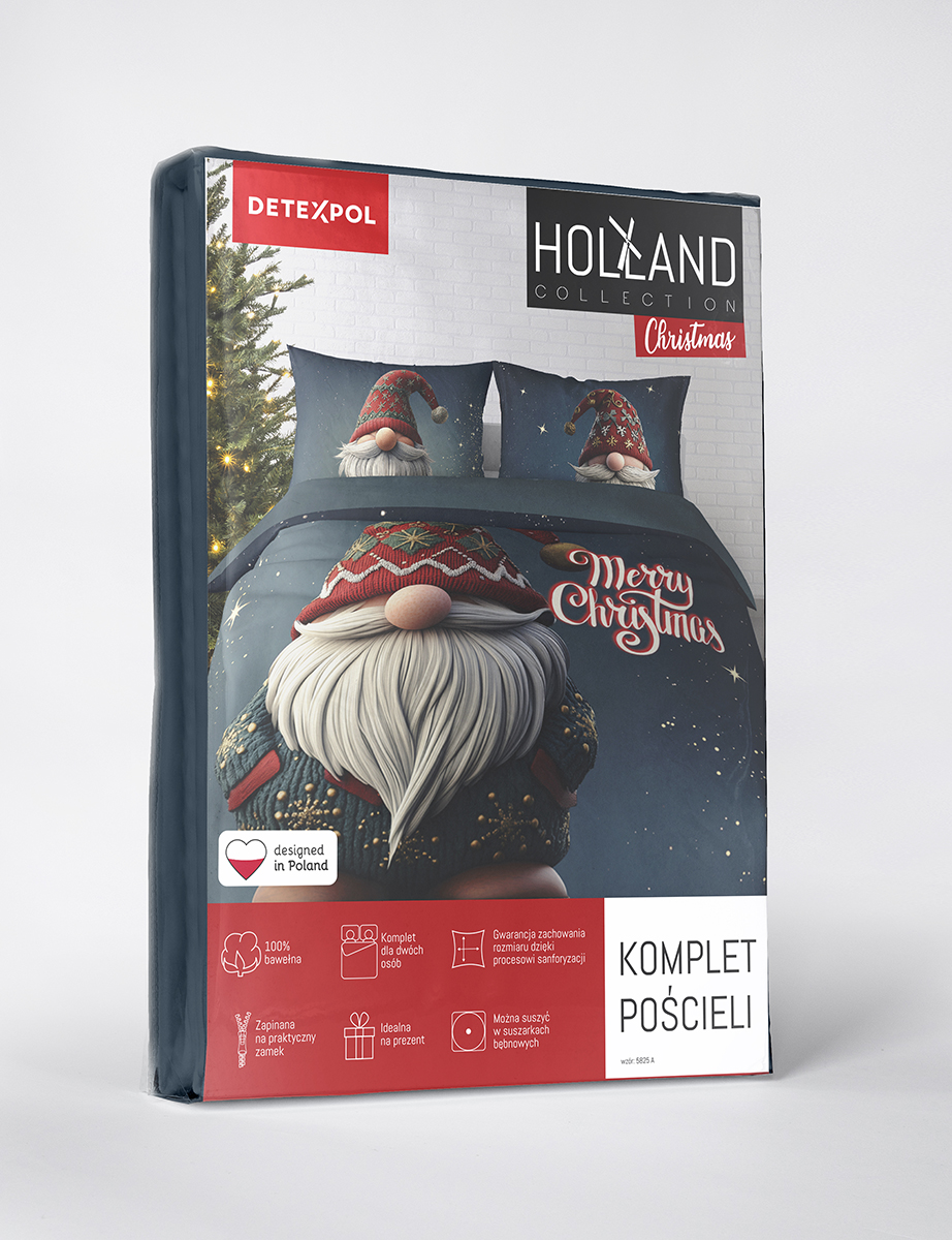 Komplet pościeli wykonany z najwyższej jakości bawełny z wyjątkowym, świątecznym nadrukiem. Kolekcja Holland Collection. Wykorzystana do uszycia tego eleganckiego kompletu bawełna jest jedwabista, delikatna i bardzo miła w dotyku - komfort snu gwarantowany. Każda z poszewek posiada zamek błyskawiczny osłonięty materiałem, tak aby nie był odczuwalny. Żywe kolory które utrzymują się nawet po wielu praniach i atrakcyjny świąteczny wzór przykuwają uwagę i dodają niesamowitego uroku sypialni.
